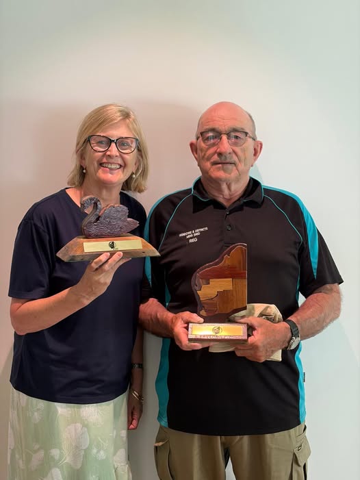 Photo is of our member Reg Tipple and Kitty from Chamber of Commerce with previous years Trophies this years trophies will be shown after awards night.